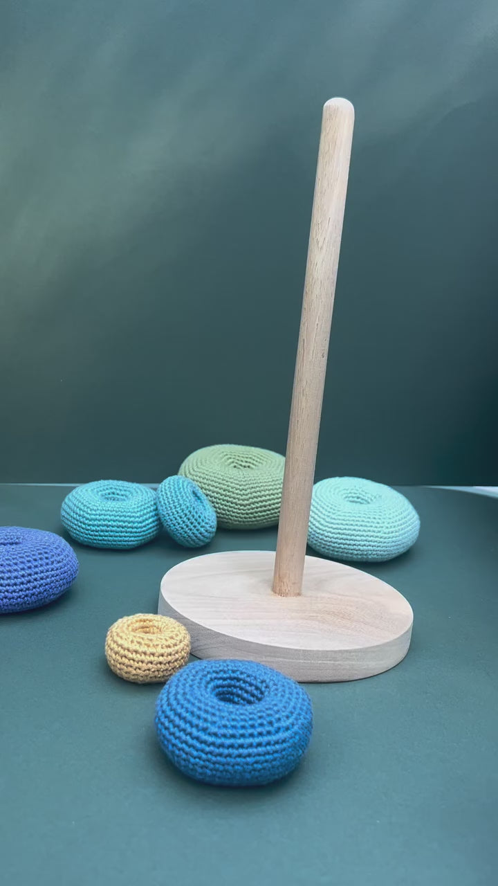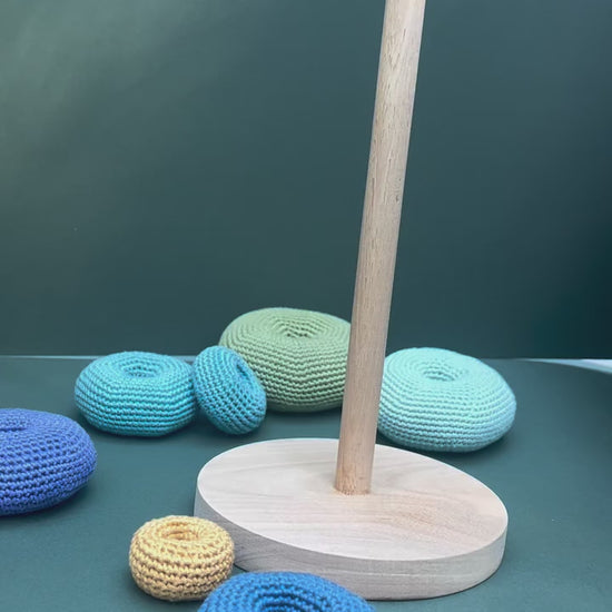Aros apilables de crochet con base de madera: set artesanal de aros tejidos a mano en suaves colores pastel, diseñados para encajar fácilmente sobre una base de madera pulida y estable. Perfectos para el juego sensorial y el desarrollo de la coordinación motora fina, la discriminación de tamaños y el aprendizaje de colores.