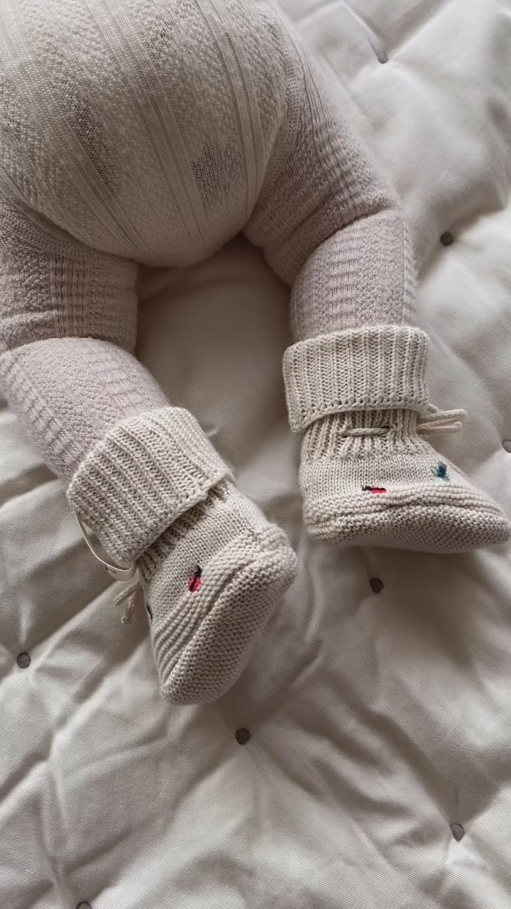 Las botitas de punto, confeccionadas con amor en 100% algodón orgánico, son mucho más que un simple calzado. Son un cálido abrazo que acompaña los pasos iniciales de tu pequeño, llenos de ternura y conciencia por el planeta. Cada detalle, desde su suave textura hasta el delicado bordado que insinúa una pequeña aventura, refleja una combinación perfecta de confort y creatividad. Ideales para que los pies de tu bebé exploren el mundo con suavidad y estilo, estas botitas inspiran la ternura y la inocencia en cada paso que da tu pequeño explorador.