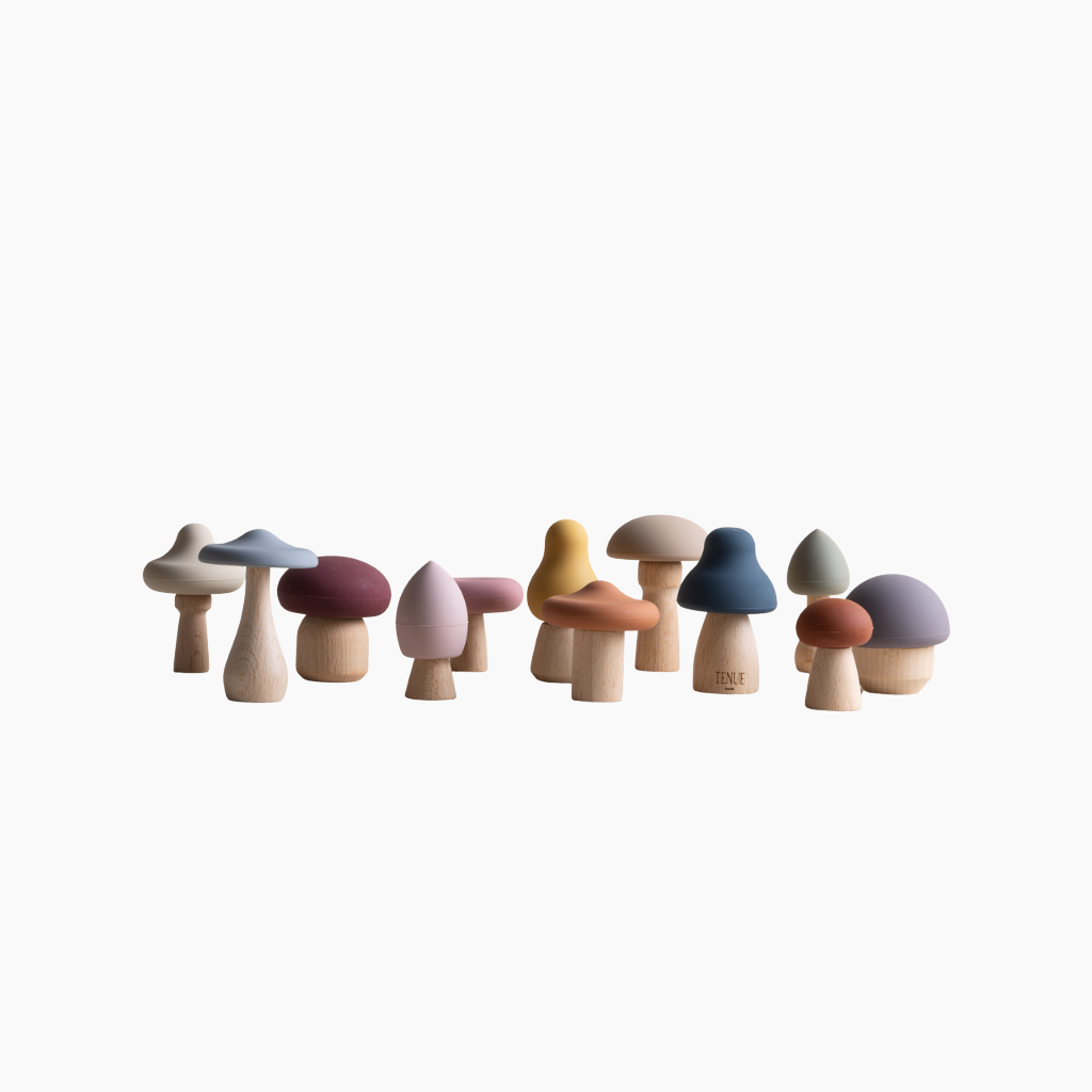 Descubre la ternura y la versatilidad con nuestro set de honguitos Tenue Shrooms Magic Forest de madera y silicona, una combinación perfecta de belleza natural y suavidad.