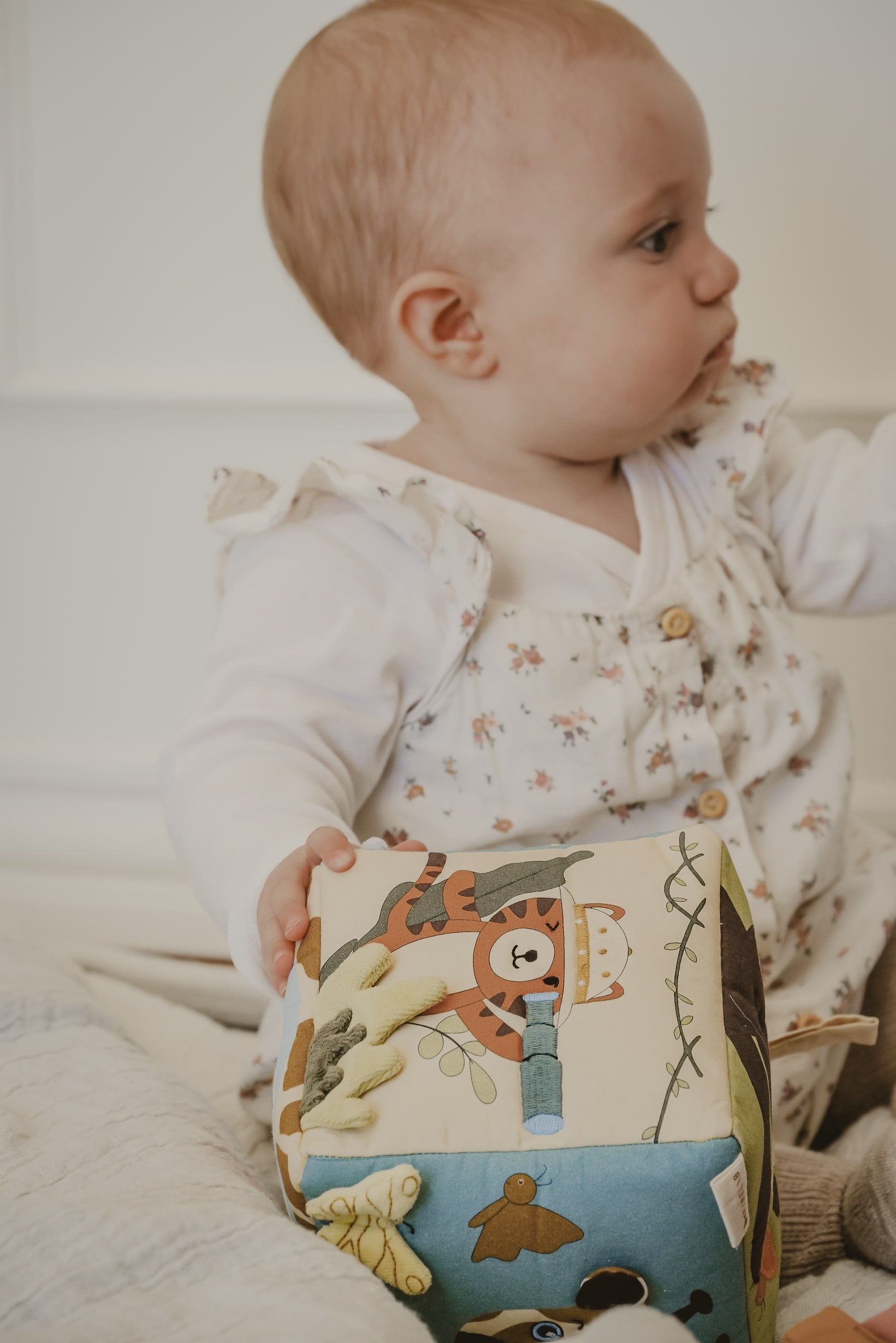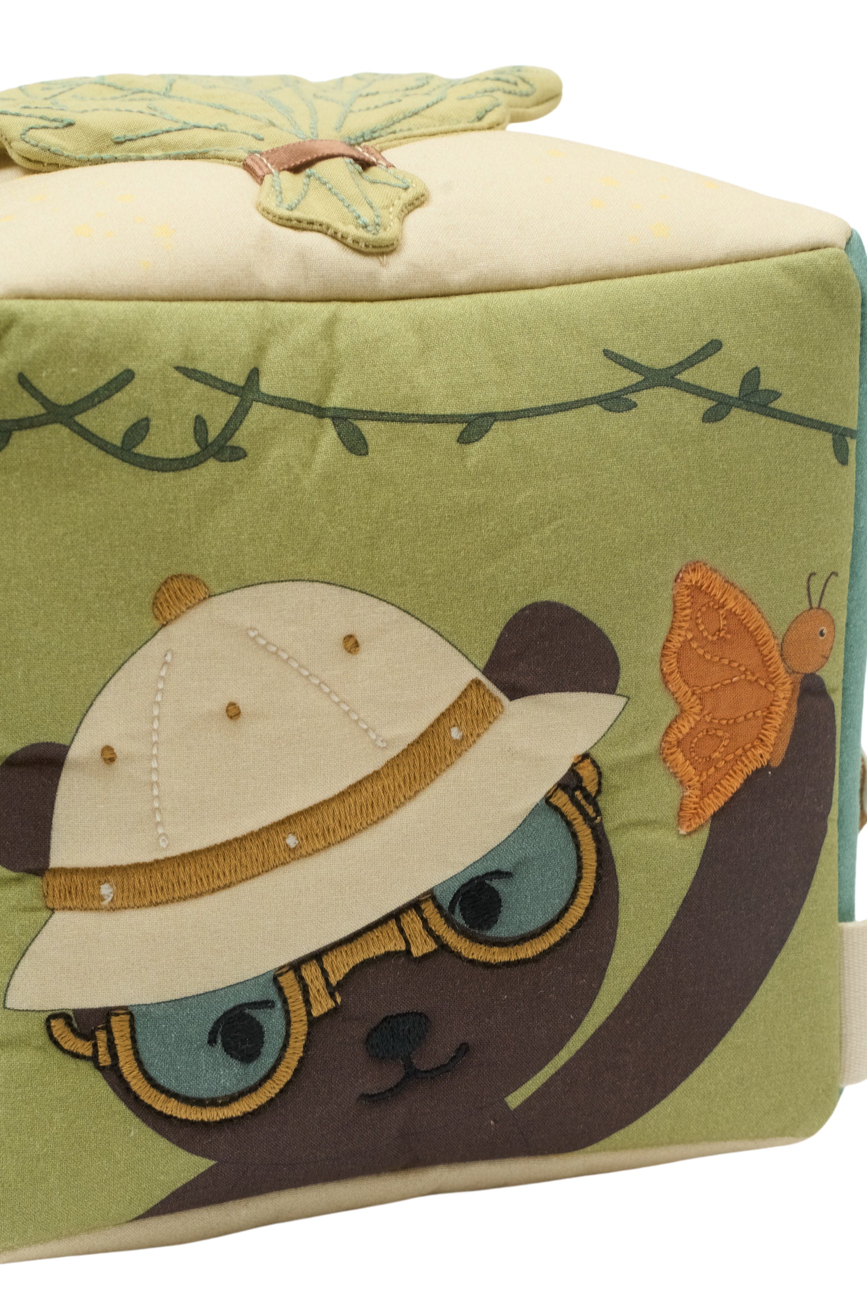 ¡Agita, aprieta y descubre! El Cubo de Tela Safari es un juguete de actividades suave lleno de sorpresas sensoriales. El bebé puede explorar superficies texturizadas, solapas, etiquetas y simpáticos animales de safari, todo en tonos tierra y relajantes.