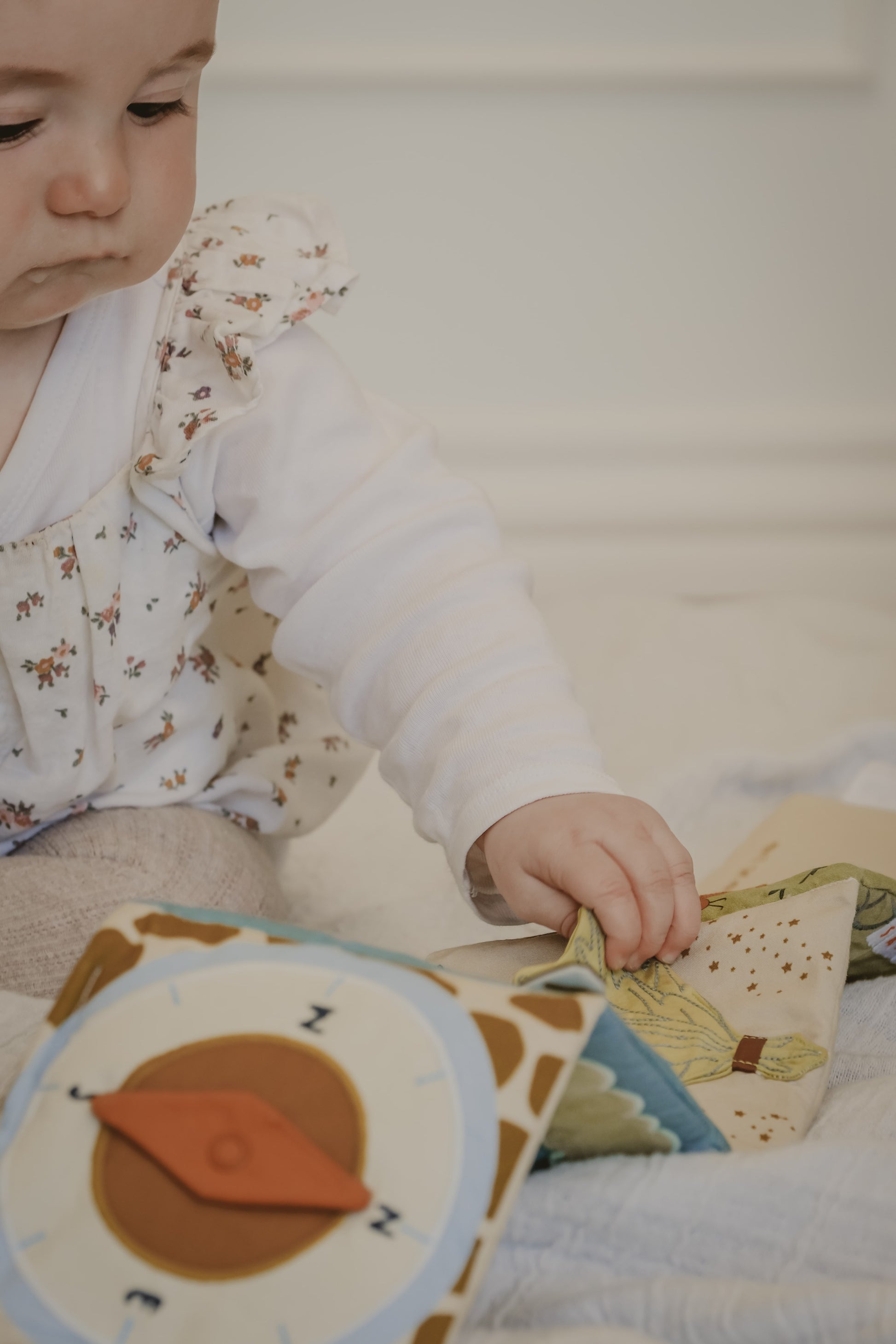 Con páginas suaves y crujientes, tonos relajantes y texturas delicadas, este libro es perfecto para el juego sensorial y el descubrimiento tranquilo. Hecho de algodón 100% orgánico.