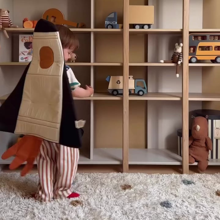 Transforma los momentos de juego en emocionantes aventuras espaciales con estas alas de disfraz de nave espacial, la solución perfecta para fomentar la creatividad, la autonomía y el interés en la exploración del universo. Diseñadas en un hermoso patrón de patchwork en 100% algodón orgánico, estas alas súper suaves y cómodas ayudan a resolver el problema de encontrar disfraces fáciles de poner, duraderos y agradables para la piel de los niños. Perfectas para horas de imaginación activa, motivan a tu pequeño astronauta a soñar en grande, explorando nuevos mundos y desarrollando confianza en sí mismo, sin preocuparse por molestias o complejidades. ¡Prepárense para despegar hacia un universo de diversión y aprendizaje!