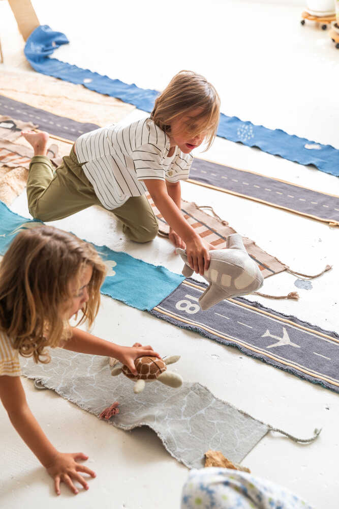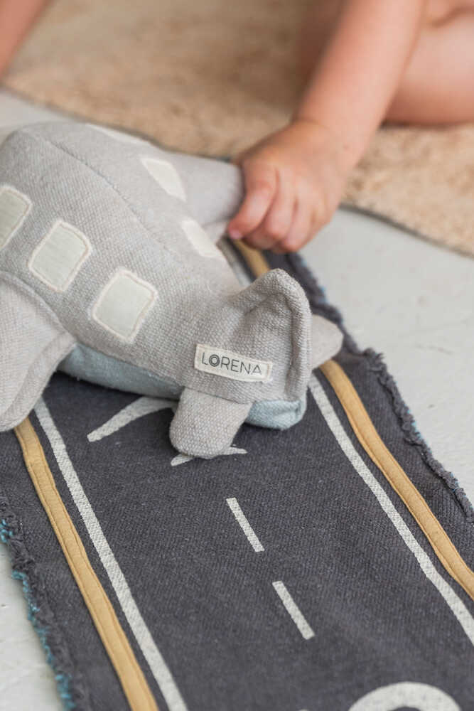 El avión de felpa, elaborado con retazos textiles reciclados de nuestra propia fábrica, invita a los niños a explorar y volar más allá, mientras el camino de lona de 4 metros decorado con nubes blancas y pistas de aeropuerto en gris ofrece un espacio de juego amplio y creativo. Este conjunto fomenta aventuras en cualquier entorno, ayudando a los niños a desarrollar su imaginación, coordinación y espíritu explorador de forma segura, sostenible y práctica.