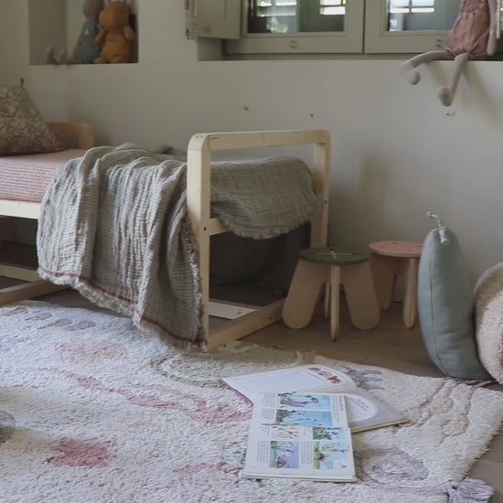 Más que una alfombra, es un espacio de juego seguro y ordenado: los niños pueden interactuar con los detalles del estampado, desarrollar creatividad y explorar su fantasía sin ensuciar demasiado, mientras los padres disfrutan de la practicidad de un tapete fácil de lavar y mantener. Su textura suave y diseño delicado convierten cualquier espacio en un refugio acogedor, fomentando momentos de diversión, exploración y conexión con la naturaleza desde casa.